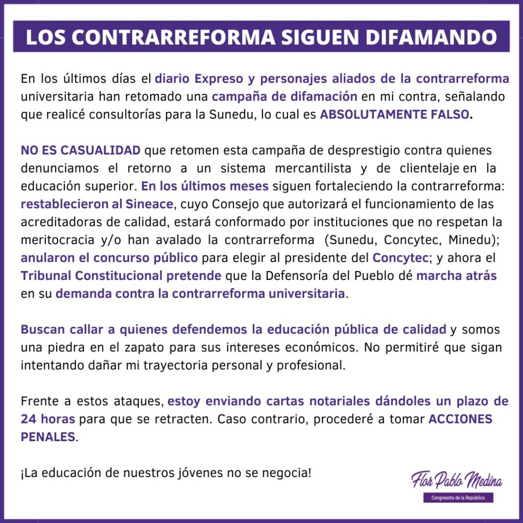 En los últimos días el diario Expreso y personajes aliados que articulan en contra de una educación de calidad y que han llevado acabo el desarme de la SUNEDU, me sigue difando. No permitiré que sigan intentando dañar mi trayectoria personal y profesional. He enviado cartas notariales para que se rectifiquen públicamente, caso contrario procederé a tomar acciones penales.